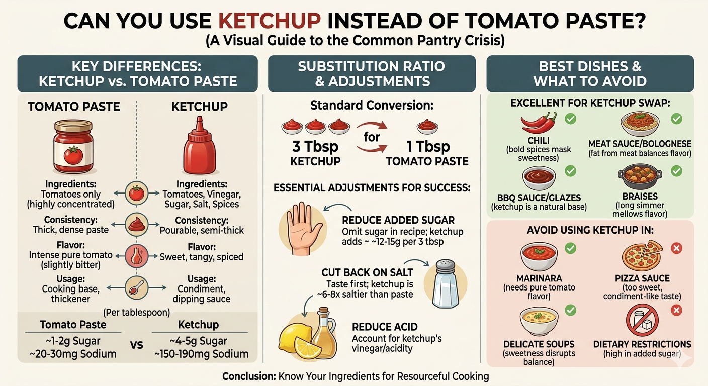 トマトペーストの代わりにケチャップを使うのはキッチンでの正当な回避策です — 完璧な代替品ではありませんが、選択肢がないときに食事を節約できる実用的なものです。重要なのは、違いを理解することです。ケチャップはより甘く、より薄く、より塩味があり、より酸性です。 3:1の比率を適用し、他の砂糖と塩を減らし、早めに調理し、適切な料理を選択してください。
